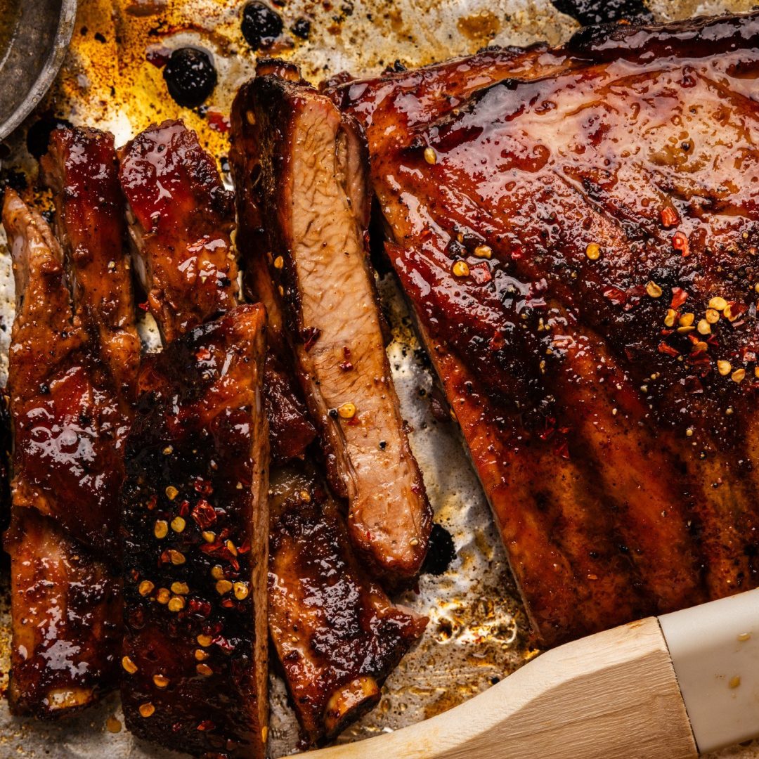8. Rest the ribs for 5 mins, slice between the bones, and sprinkle with sea salt, cracked black pepper and chilli flakes.
